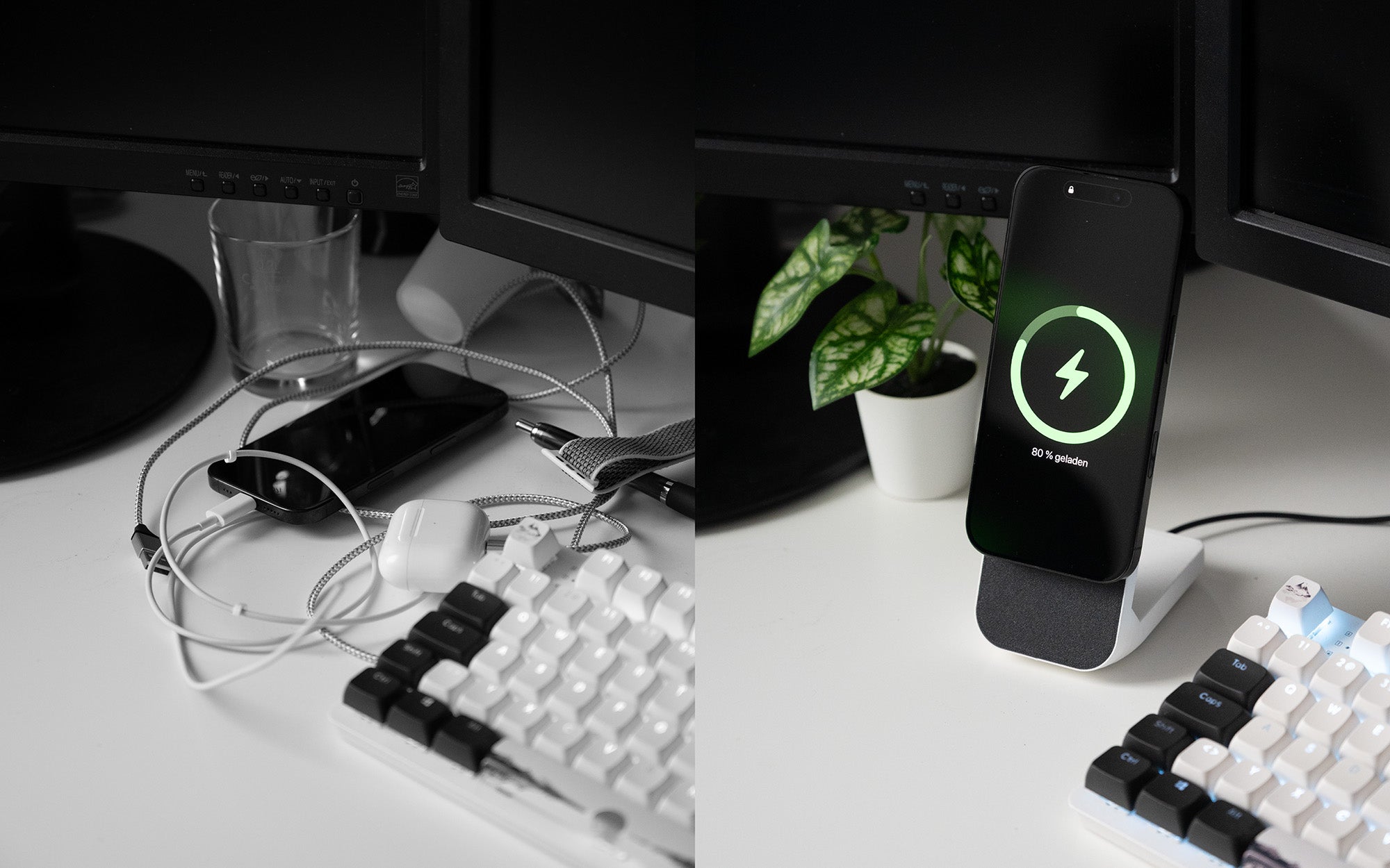 Unsere Ladestation beseitigt nicht nur das Kabelchaos auf deinem Schreibtisch, sondern wertet auch deinen Arbeitsplatz auf. So kannst du dich auf das Wesentliche konzentrieren.